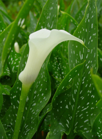Zantedeschia aethiopica - the winter flowering varieties such as the common white arum, Green Goddess and Z. odorata. These are characterised by shiny green leaves that do not die down in winter.